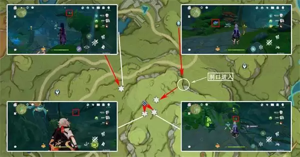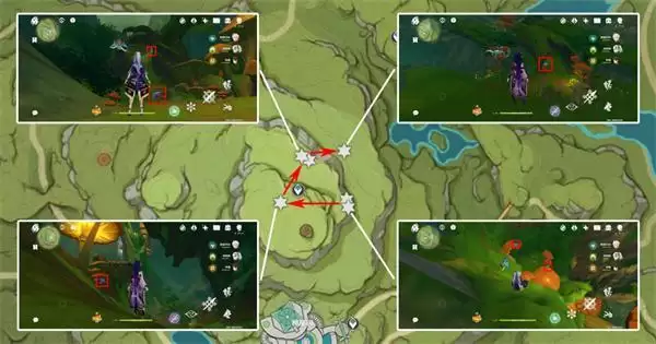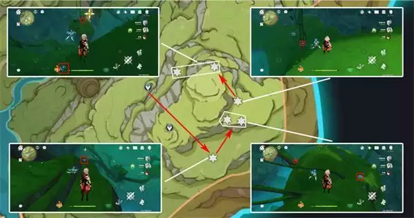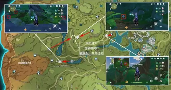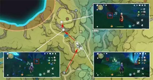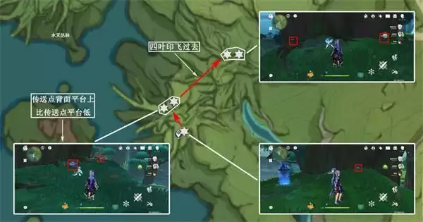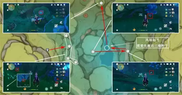 3、上个采集点落到地面,右侧两个采集点均在地面,而后利用风场起飞,飞向*北面采集点,在伞帽下面,需要先激活三乘种子并弹奏相关曲调(完成森林书可获得),左下采集点均在地面上;
