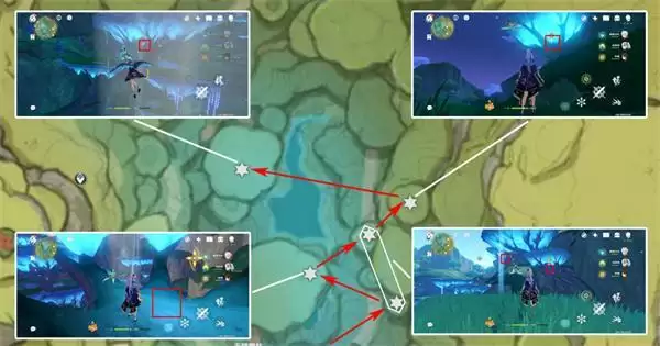 24、传送到传送点后,先向西南方向飞,从传送点西南方绕到背面,四处采集点均在树枝上或者石头平台上;