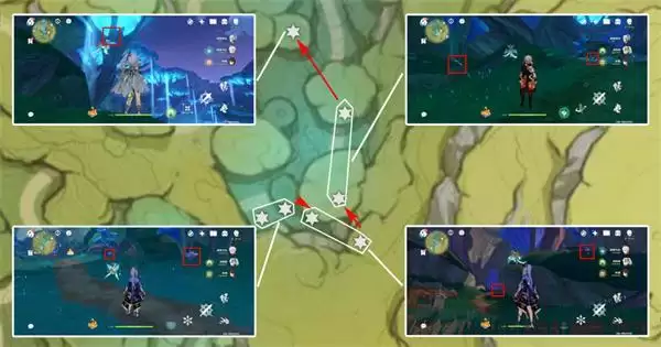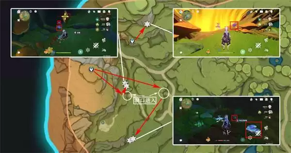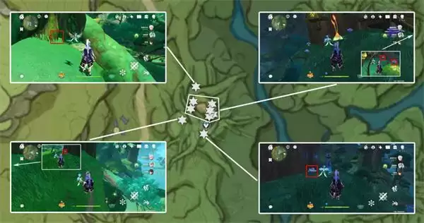 tip:此处需先从图中下方传送点前往图中五角星处,通过洞口进入地下,方可采集,树王圣体菇分散分布在树根处;