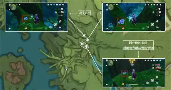 22、三处采集点均在树干的平台上,注意利用四叶印时别搞错方向;