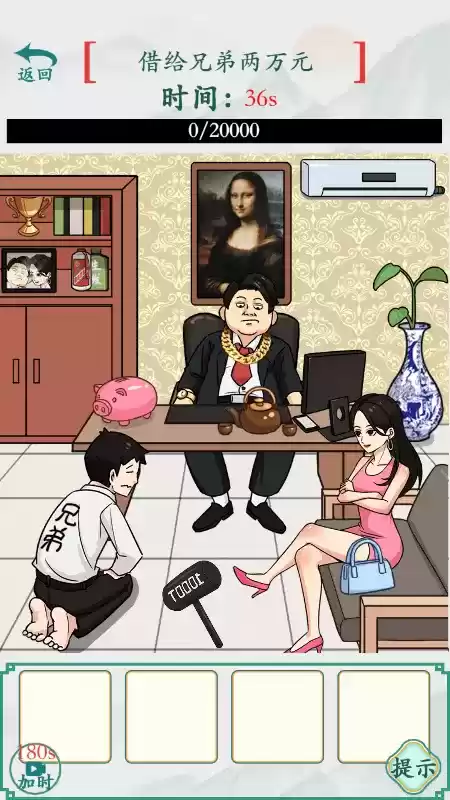 最囧大烧脑借给兄弟两万元是游戏中的最新关卡,不少玩家想要知道这个攻略怎么过。不了解这个该怎么快速过关的小伙伴们,其实这个还是很容易的,就让小编给大家详细的讲讲,一起来看看吧。