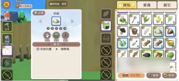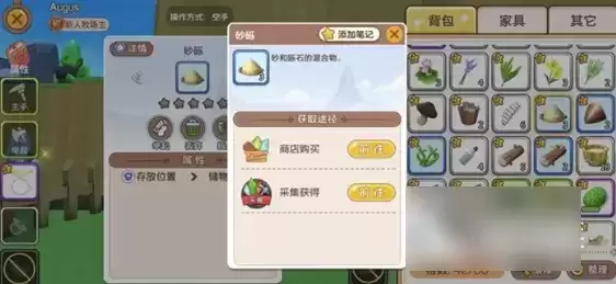 砂砾是砂和砂石的混合物,在游戏中是一种非常重要的制作素材,很多工具的制作与强化都是需要砂砾作为素材的。而想要获取砂砾的话,我们有两种途径大量获得,第一种是采集,第二种就是通过购买了。在我们自己农场的空地上以及北部后山都可以发现大量的砂砾,在砂砾四周点击采集按键就可以将这些砂砾收集起来。