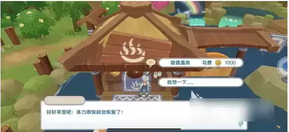 温泉的位置在后山区域,也就是在我们自己农场的北部,我们通过打开地图可以看到温泉在森林的东北部,在乱石的东南面。达到位置之后我们可以看到一处温泉标志的牌子,这里有一个木门,穿过木门看到有接待区,在这里互动可以看到我们可以消耗1000金币来泡普通温泉,在学习心神温泉之后就可以泡*温泉了。