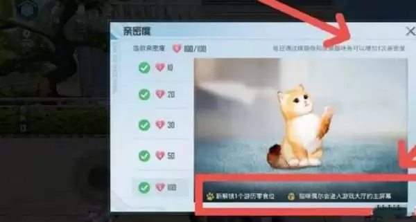 2、这样就可以看到和猫咪的亲密度了,要达到100后才能带它进入大厅。