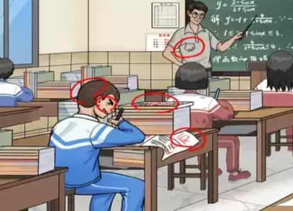 1、一代沙雕勤奋成就梦想共分为四个场景,教室场景要找出他被笑话的原因,图中已标出,兜里的纸需要上划才能得到