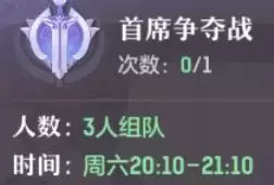 1、首席挑战,是每周晚上8点10开始的,一周只有一次3V3的竞技机会。队长可以获得首席积分,当然对于普通玩家来说只是为了活动奖励道具之类的。