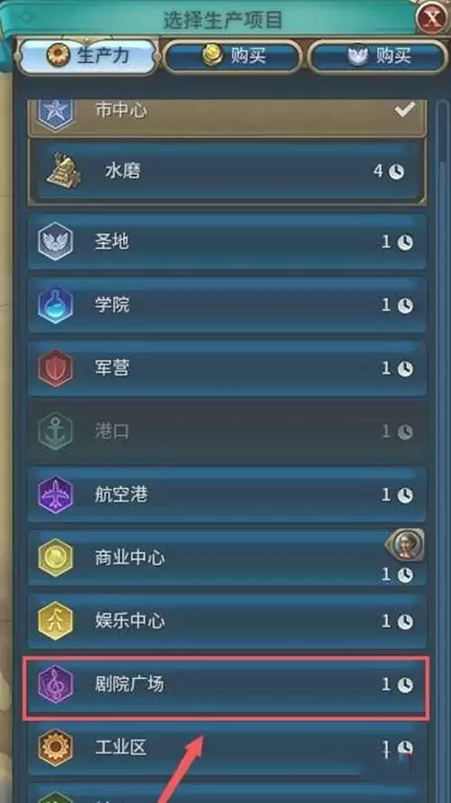 2、点击城市建造,建设剧院广场。