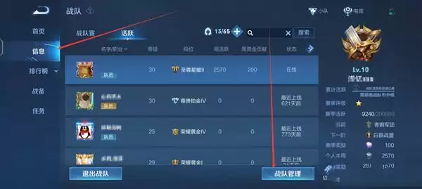 2、点击左侧的信息,再点击下方的战队管理。