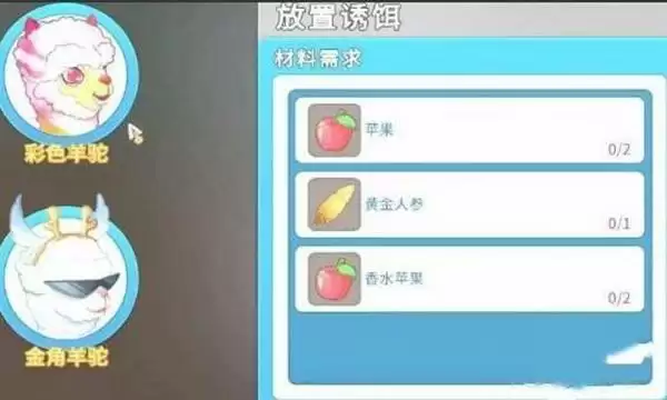 2、来到捕捉地点后,查看你要抓的羊驼,准备好对应的诱饵。