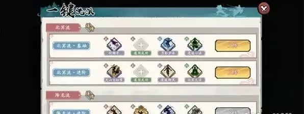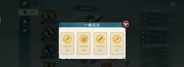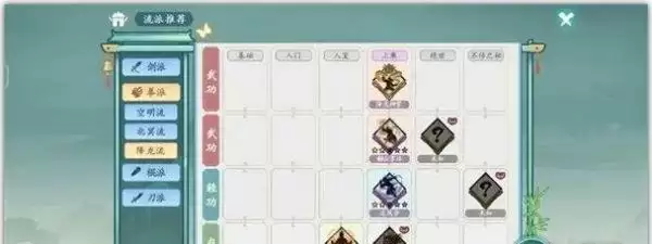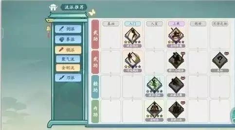 图四,流派名称及需求的武学有哪些,正常一套是两武学,一轻功,一内功,总共带四本武学,图四里面空着的➕号点进去可以看替代的武学有哪些。品阶高的武学很难频繁抽到拿来升级,所以一些品质低,高等级才是中流砥柱!主要还是看搭配的嘛