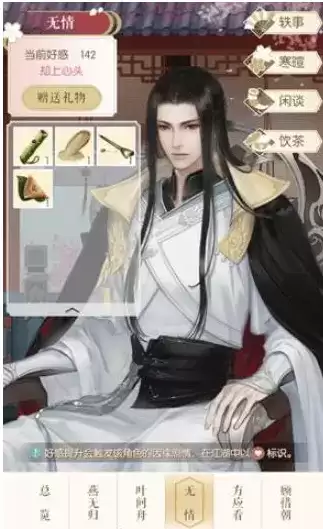 2、【寒暄】、【闲谈】、【饮茶】功能则可以与角色进行对应的互动,需要好感度达到一定要求后才可以解锁。