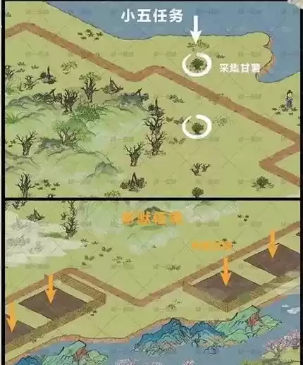 1.江南百景图双人探险荒野森林小五先采集甘薯后老默再种植。