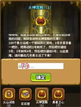 5、喂喂喂,我是火山部落的三祭司,只要你能回答我的问题,我的问题,我就告诉你火神宫殿的位置!100个勇土站成个器玩死亡游戏,1号手里拿着一把剑,把旁边的2号刺死了,然后把剑递给3号:3号刺死4号,然后把剑递给5号.,以此类推,请问最后几号勇士活了下来?