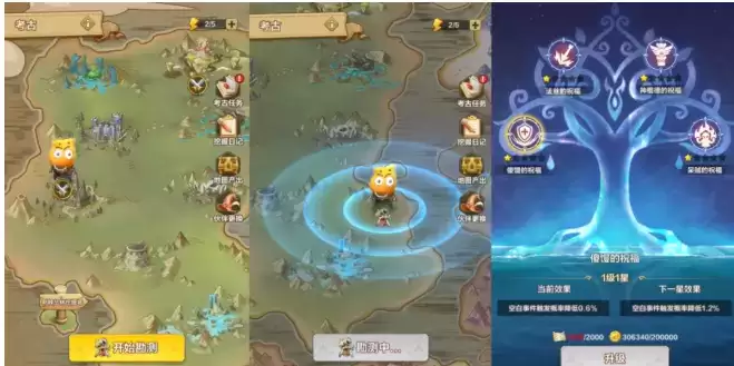在“考古”新玩法中,世界上每个不同的地图板块都可以产出不同的珍稀藏品,各位勇士可以通过消耗体力驱动哀木涕在地图上进行勘探寻宝。有趣的是,每次挖宝都有可能触发不同的奇遇事件——哀木涕这一铲子挖下去,勇士们不仅有可能直接获得宝箱,也有可能陷入一场战斗或者小游戏挑战之中。当然,也有可能遇到盗宝贼,或者掉进山洞里……至于是满载而归还是两手空空,就看各位勇士们的运气与耐心啦!此外,勇士们可以随心更新考古伙伴,还可以通过升级不同伙伴的祝福,提升挖宝时的运势!