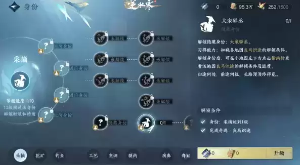 4、完成奇遇后我们打开<菜单-身份-采摘-技艺页面>,升级右下角的“大宋驿丞”隐藏身份。