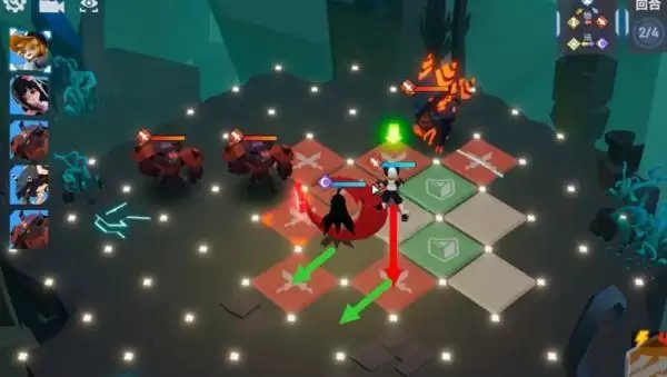 2、金位移到凯莉身后,攻击前方的小怪,然后凯莉原地平A面前的小怪。然后金按着绿线走到左边的格子,攻击前方的小怪,然后凯莉也跟进补掉小怪。
