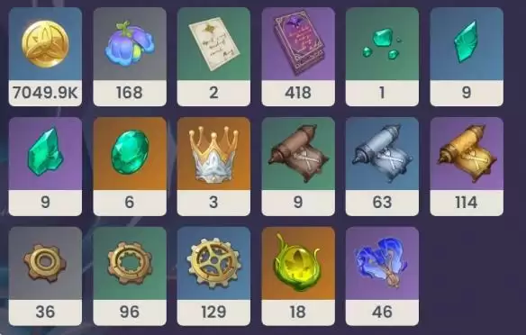 8→9:【秩序】的哲学*12、奇械机芯齿轮*9、亘古树海之一瞬*2、450000摩拉