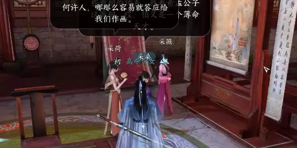 7、我们需要使用水系技能对准画卷,然后我们就可以获得任务道具,获得任务道具之后我们返回找到采薇继续对话;