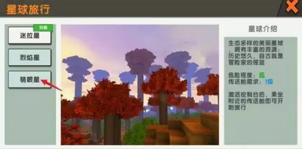 2、打开星球旅行页面,选择传送到萌眼星上面去。