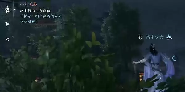 2、接着在对话中得知,我们需要帮助何良梁跳到假山上拿蹴鞠,接着我们就跳跃几下就可以上到假山上。