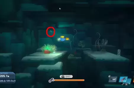 2、我们在水下205m左右如图示的位置就可以找到黑色海马了,从海底湖左边的洞里出来往下游就可以找到。