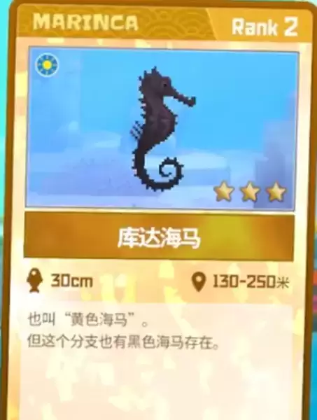 1、这个海马的名称叫做库达海马,是一个黑色的海马,在水下130m-250m之间可以捕捉到。
