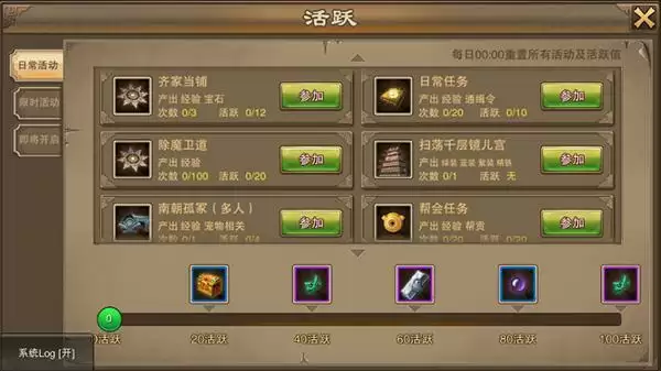 v 玩法说明:通过参与游戏中的活动、副本、任务可获得活跃值,活跃值每提升20点,即可领取相应的奖励。其中通过完成副本、日常任务、除魔卫道、帮会任务获得的活跃值较多。