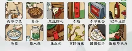 答案:【月饼、西餐刀叉、汤圆。腊八蒜、挂红包、重阳菊花、偷藏巧克力、团圆饺子、春联、玫瑰赠礼、春节晚会、82年拉菲】