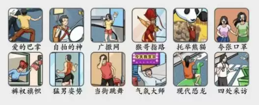 答案:【爱的巴掌、猴哥指路、托举熊猫、自拍的神、广撒网、四处采访、裤衩旗帜、猛男姿势、当街跳舞、气氛大师、现代恐龙、夸张口罩、今天我生日】