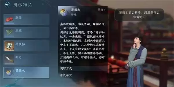 2、接着我们就寻找到眉儿,把购买的蔷薇水送给眉儿,然后我们就与眉儿进行对话即可。