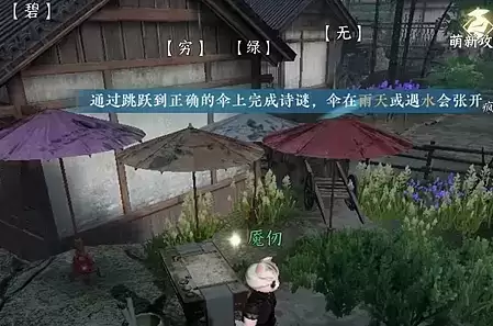 3、根据[无][穷][碧],我们按照红、黄、紫的顺序跳到雨伞上即可,注意:伞只有下雨和遇水的时候才会张开。