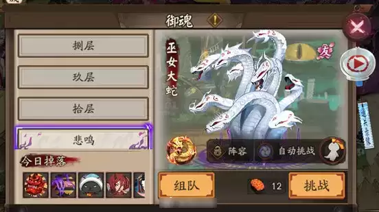 挑战巫女大蛇·悲鸣的体力消耗是普通御魂副本的2倍,单人12体力/组队8体力一次。奖励掉落5星与6星御魂,经验强化狗粮方面掉落4星青吉鬼。