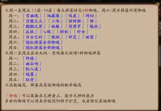 在御魂副本1-10层原本掉落的基础上,巫女大蛇·悲鸣新增了蚌精、幽谷响、轮入道、蝠翼、狂骨这5种御魂的掉落,每日掉落御魂种类增加到5。