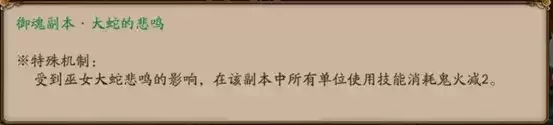 巫女大蛇·悲鸣与1-10层御魂副本一样,分为总计3回目的挑战,整个副本挑战中鬼火消耗-2,即1火与2火技能不消耗鬼火,3火技能实际消耗1火,4火技能实际消耗2火。