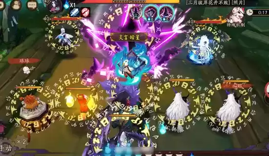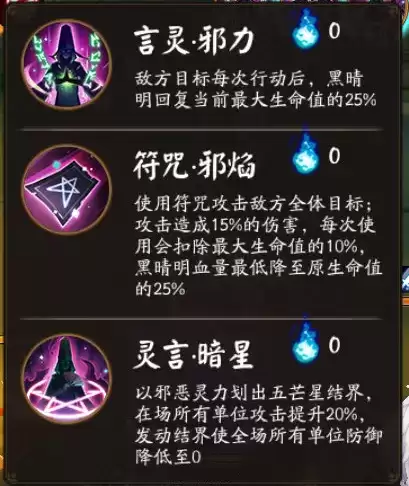 黑晴明开局自动施放技能【灵言·暗星】为敌方以及我方单位增加20%攻击力,防御降低为0。