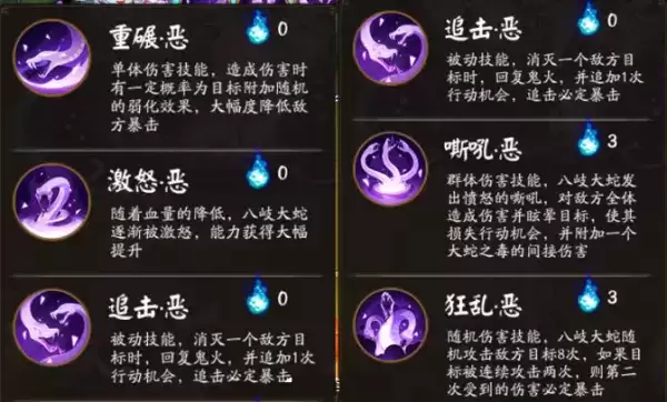 巫女大蛇是魂十八岐大蛇的全面强化版,原有的普攻/强化/追击/AOE技能效果都得到提升,并新增了随机攻击的【狂乱】技能。