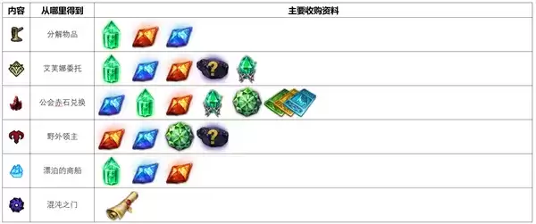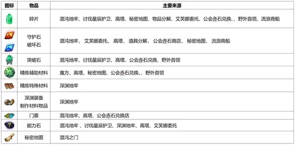 3、最后我们需要搞明白素材怎么获取,例如碎片是通过地牢、委托可以获得,守护石和破坏石通过分解、高塔等途径,50级后就更需要这些素材了。
