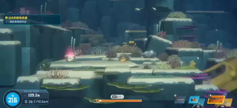 1、每张地图沉船的位置都是不固定的,但是大概的位置都会在水下的110米处,我们可以通过找到达夫的粉色快递来确认沉船的位置。