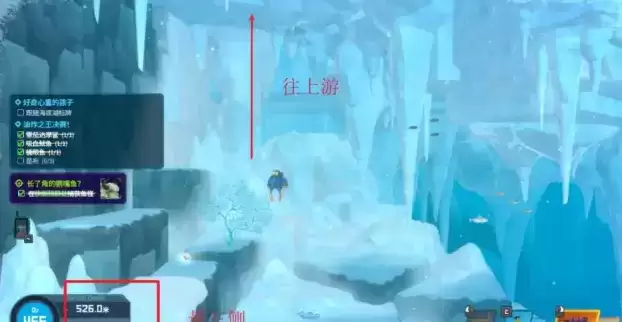 1、首先我们来到深海冰川场景的526米处,在地图左侧往上方游。