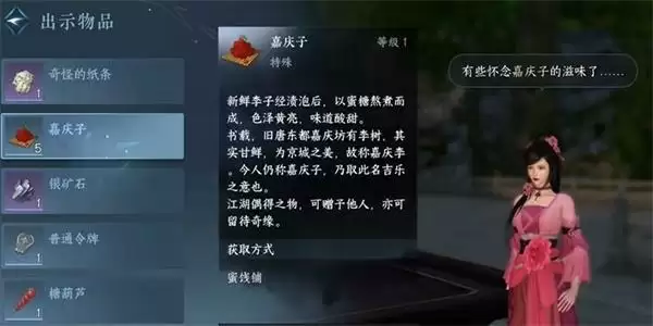 2、接着我们就在对话中得知,田思琼想要吃嘉庆子,接着我们就把背包里面的嘉庆子出示给田思琼即可。
