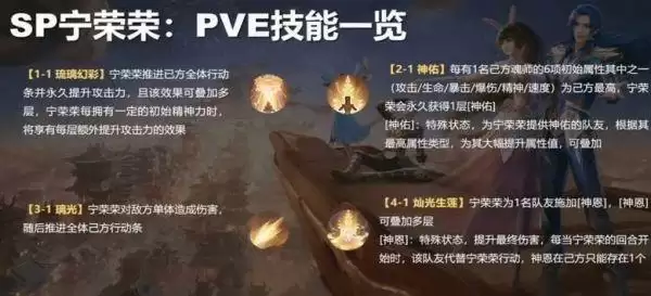 1、1-1技能:推动己方全体的行动条,并永久提升攻击力,效果可叠加多层。在宁荣荣有一定初始精神力时享受每层额外提升攻击力的效果。