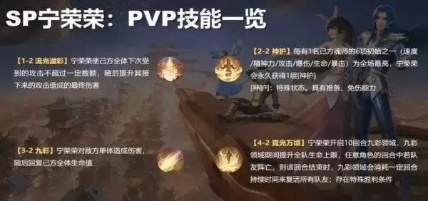 3、PVP技能1-2具有减伤和增伤效果,2-2可以免疫敌方伤害,4-2技能九彩领域至多10个敌方回合后直接获得战斗胜利,强度很高。
