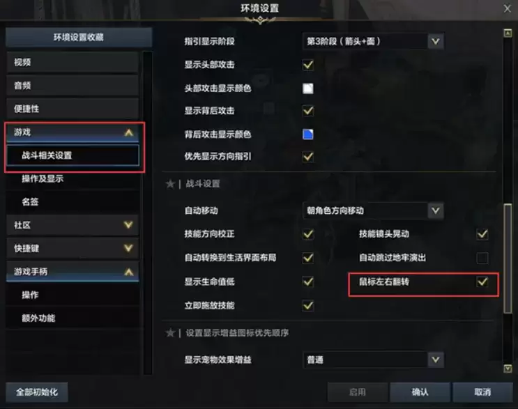 3、如果仅想翻转鼠标左右按键,那么可以在游戏>战斗相关设置中找到战斗设置里的“鼠标左右翻转”,根据自己的需求打钩或者取消钩即可。