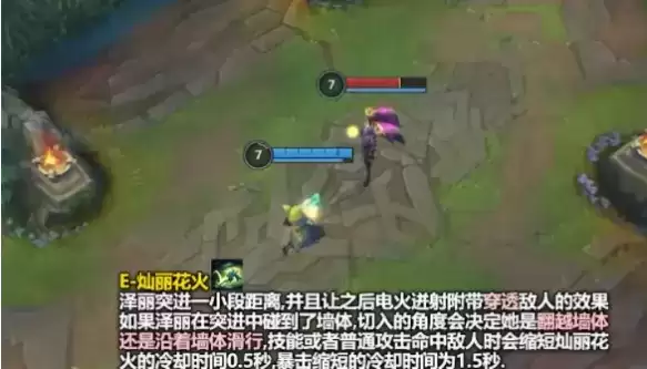泽丽向前突进一小段距离,并强化接下来的普攻效果。如果泽丽朝着墙体突进,则会直接翻越墙体。