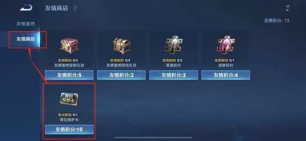 3、进入友情商店,找到排位保护卡,消耗10点友情积分就可以购买获得了。