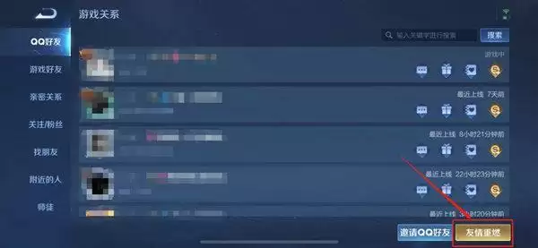 2、进入游戏关系页面,点击右下方的【友情重燃】。
