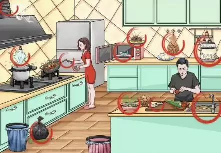 2、接着我们还可以在画面上找到烟道漏气、臭鸡蛋、拍蒜断刀、水池堵塞、活鱼现烤、熔岩蛋糕等让人血压飙升的答案。