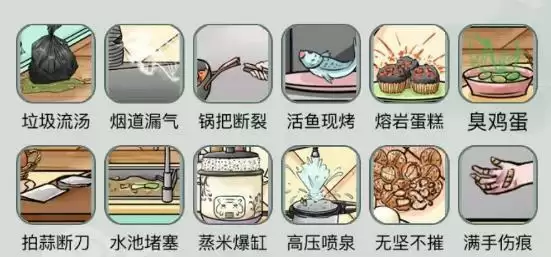 答案:【蒸米爆缸、无坚不摧、锅把断裂、满手伤痕、垃圾流汤、烟道漏气、臭鸡蛋、拍蒜断刀、水池堵塞、活鱼现烤、熔岩蛋糕、高压喷泉】
