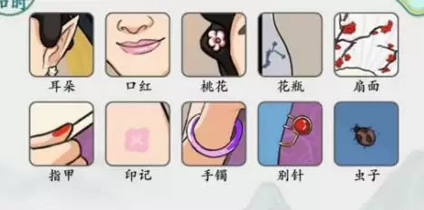 【耳朵、指甲、桃花、口红、印记、手镯、花瓶、别针、扇面、虫子】