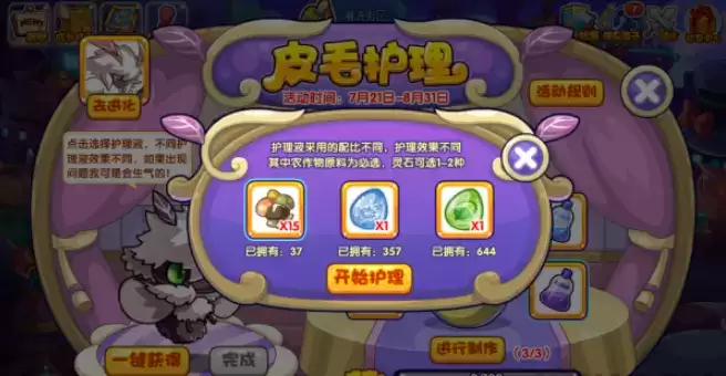 1.洛克王国皮毛护理界面包含了5个不同颜色的护理液,护理液的配方也会从农作物、灵石中提取,小洛克们可以提前准备相关材料哦。